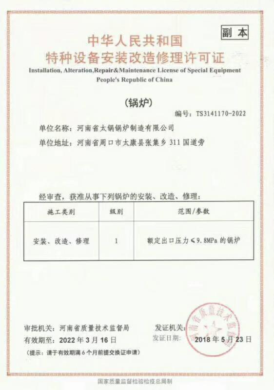河南省太鍋鍋爐制造有限公司(原河南省太康鍋爐廠始建于1976年)始建于70年代初,經40多年的艱辛探索,靠科技興業(yè),走科學管理之路,現已發(fā)展成為承接制造、安裝、設計大、中型供熱系統(tǒng),生產:SZS燃油燃氣蒸汽鍋爐、燃煤蒸汽鍋爐、燃油鍋爐、燃氣鍋爐、電加熱鍋爐、生物質鍋爐、茶水鍋爐、有機熱載體鍋爐、熱風鍋爐,蒸壓釜、燃油蒸汽鍋爐、燃氣蒸汽鍋爐、燃油熱水鍋爐、燃氣熱水鍋爐并承擔安裝120噸熱水鍋爐、蒸汽鍋爐,生物質鍋爐,加工制造一、二類蒸壓釜、壓力容器,化工機械的省一級**企業(yè)。